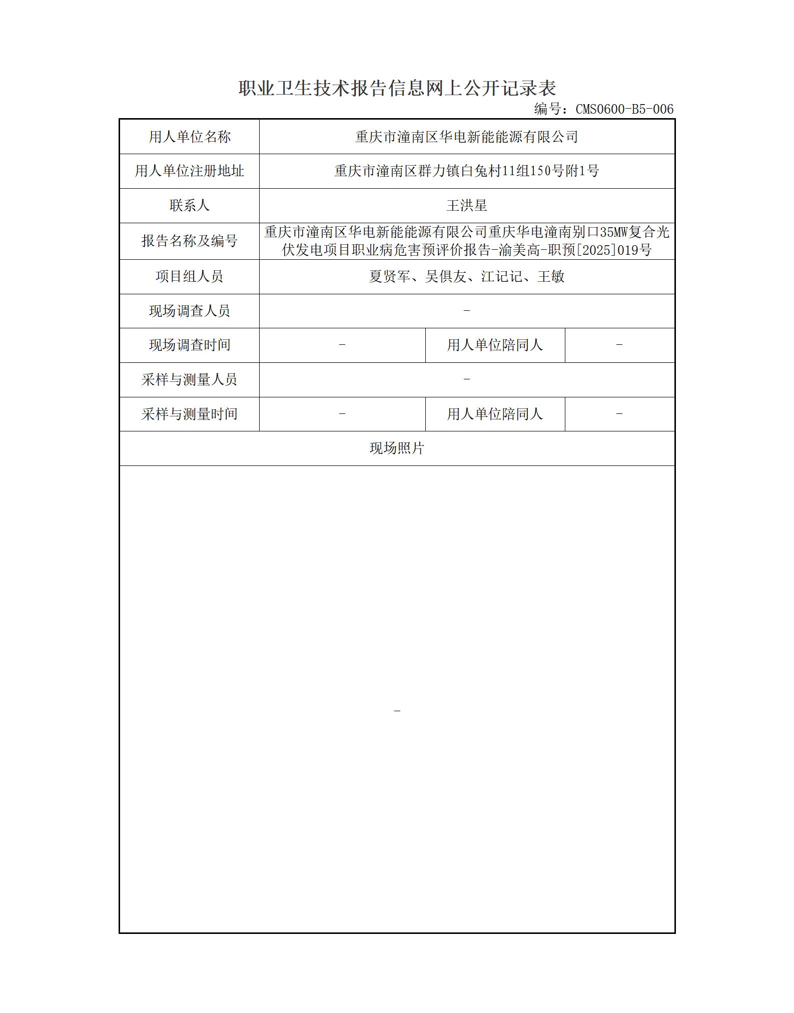 2025年-重庆市潼南区华电新能能源有限公司重庆华电潼南别口35MW复合光伏发电项目职业病危害预评价