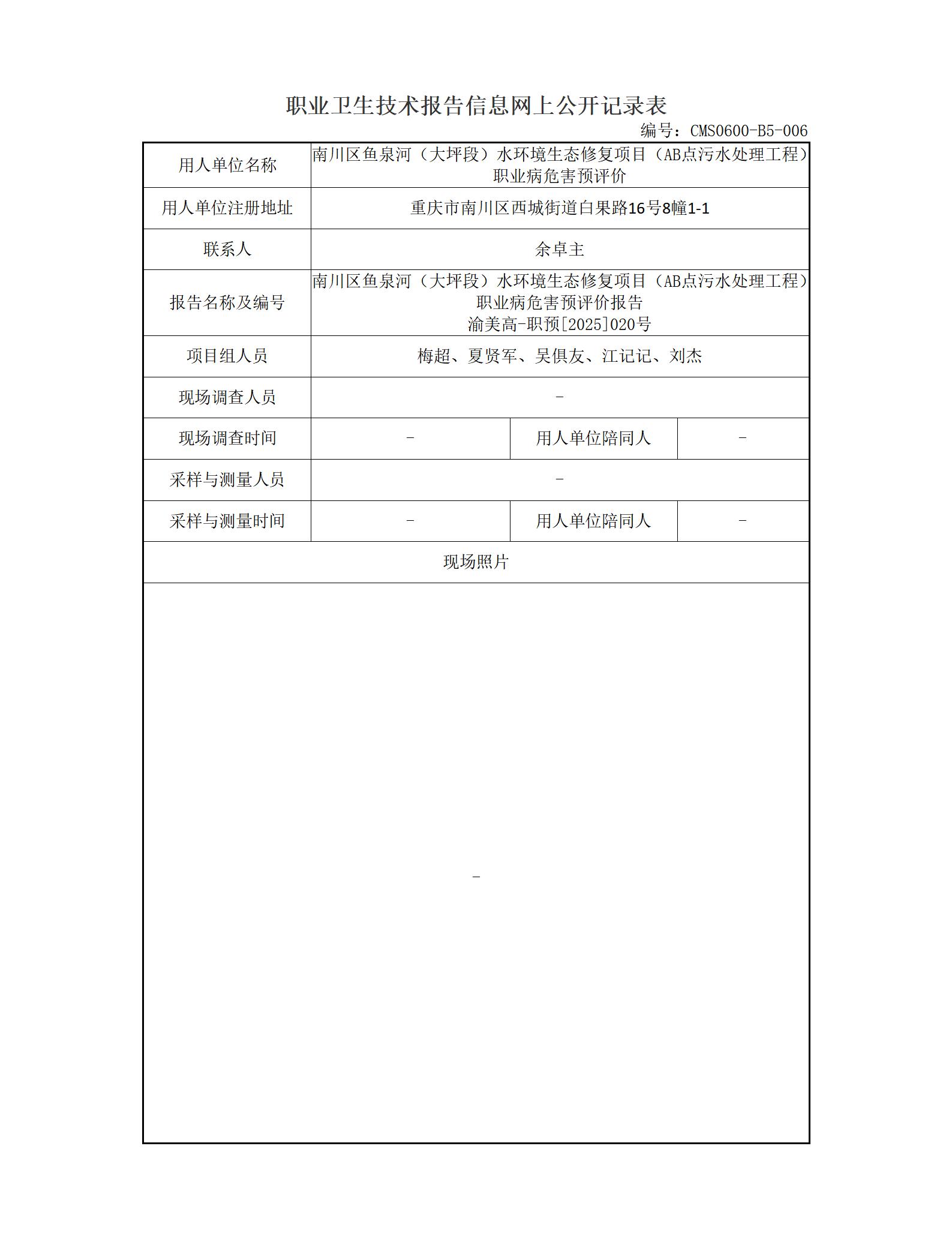 2025年-重庆鑫业园区运营管理有限公司南川区鱼泉河(大坪段)水环境生态修复项目(AB点污水处理工程)职业病危害预评价