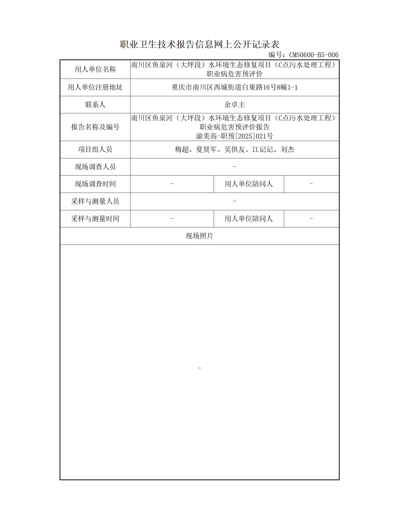 2025年-重庆鑫业园区运营管理有限公司南川区鱼泉河(大坪段)水环境生态修复项目(C点污水处理工程)职业病危害预评价