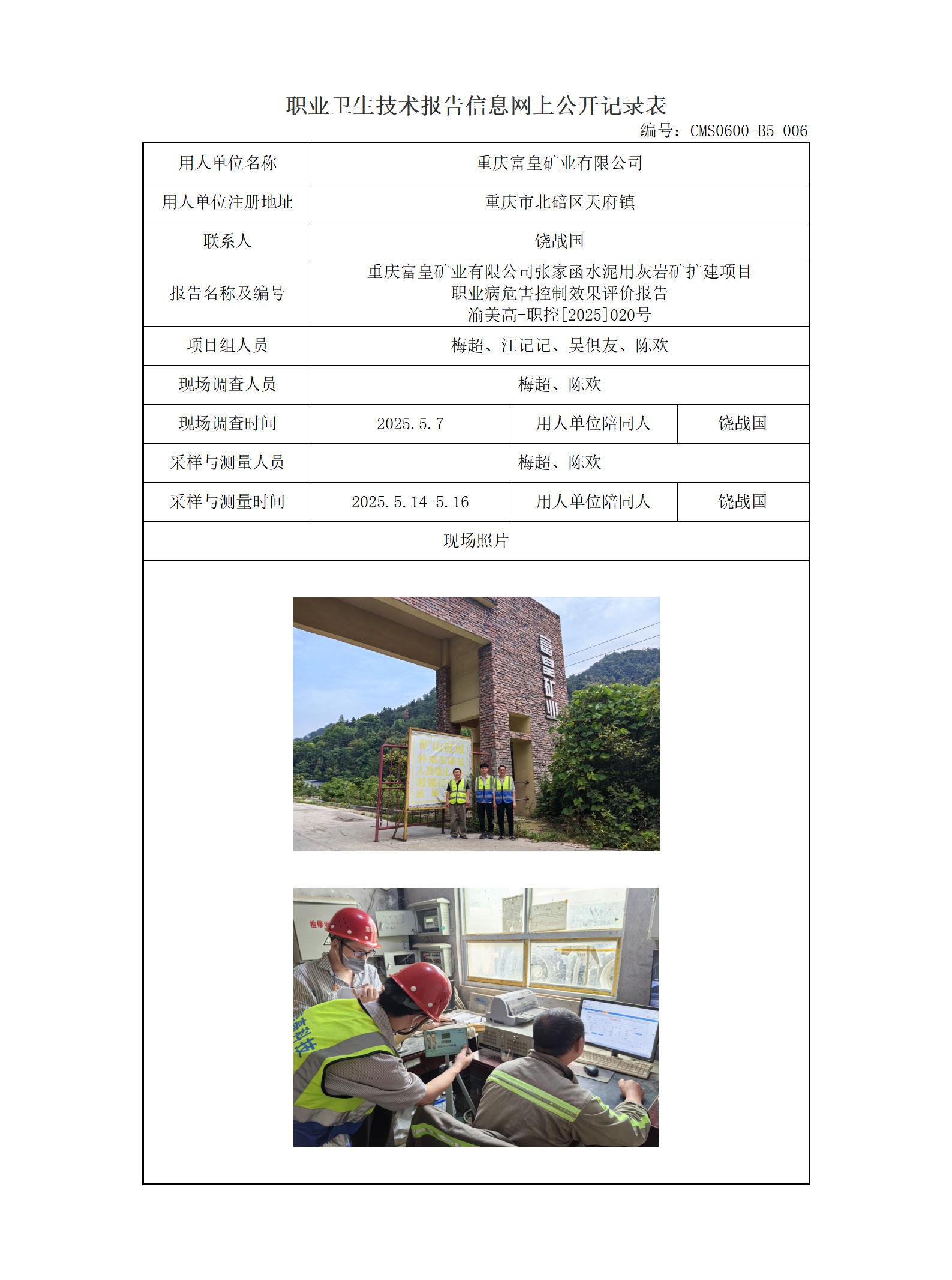2025年-重庆富皇矿业有限公司张家函水泥用灰岩矿扩建项目职业病危害控制效果评价