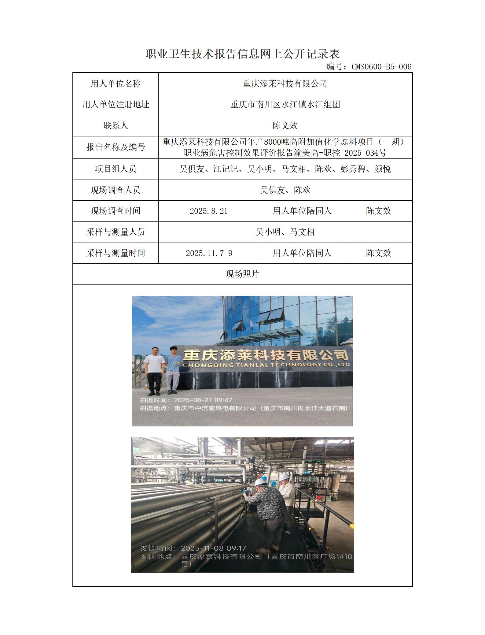 2025年-重庆添莱科技有限公司年产8000吨高附加值化学原料项目(一期)职业病危害控制效果评价