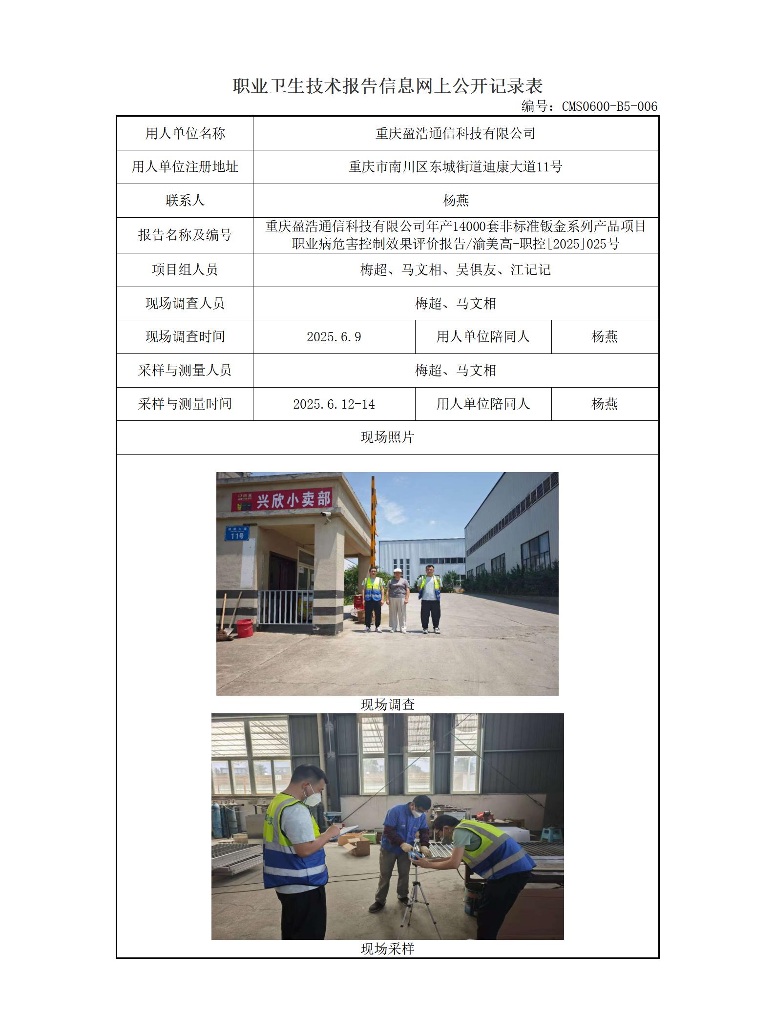 2025年-重庆盈浩通信科技有限公司年产14000套非标准钣金系列产品项目职业病危害控制效果评价