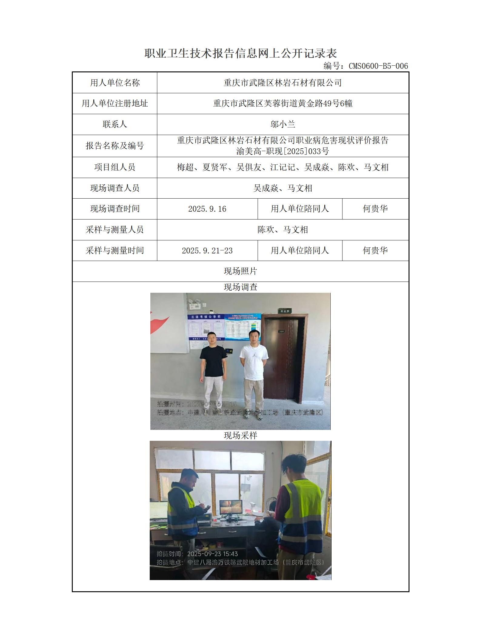 2025年-重庆市武隆区林岩石材有限公司职业病危害现状评价