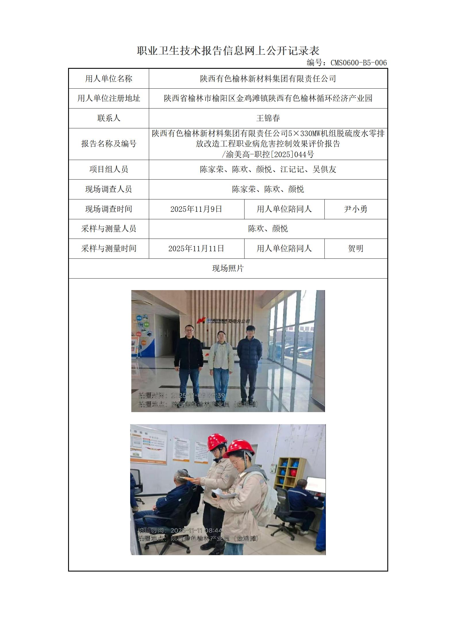 2025年-陕西有色榆林新材料集团有限责任公司5×330MW机组脱硫废水零排放改造工程职业病危害控制效果评价