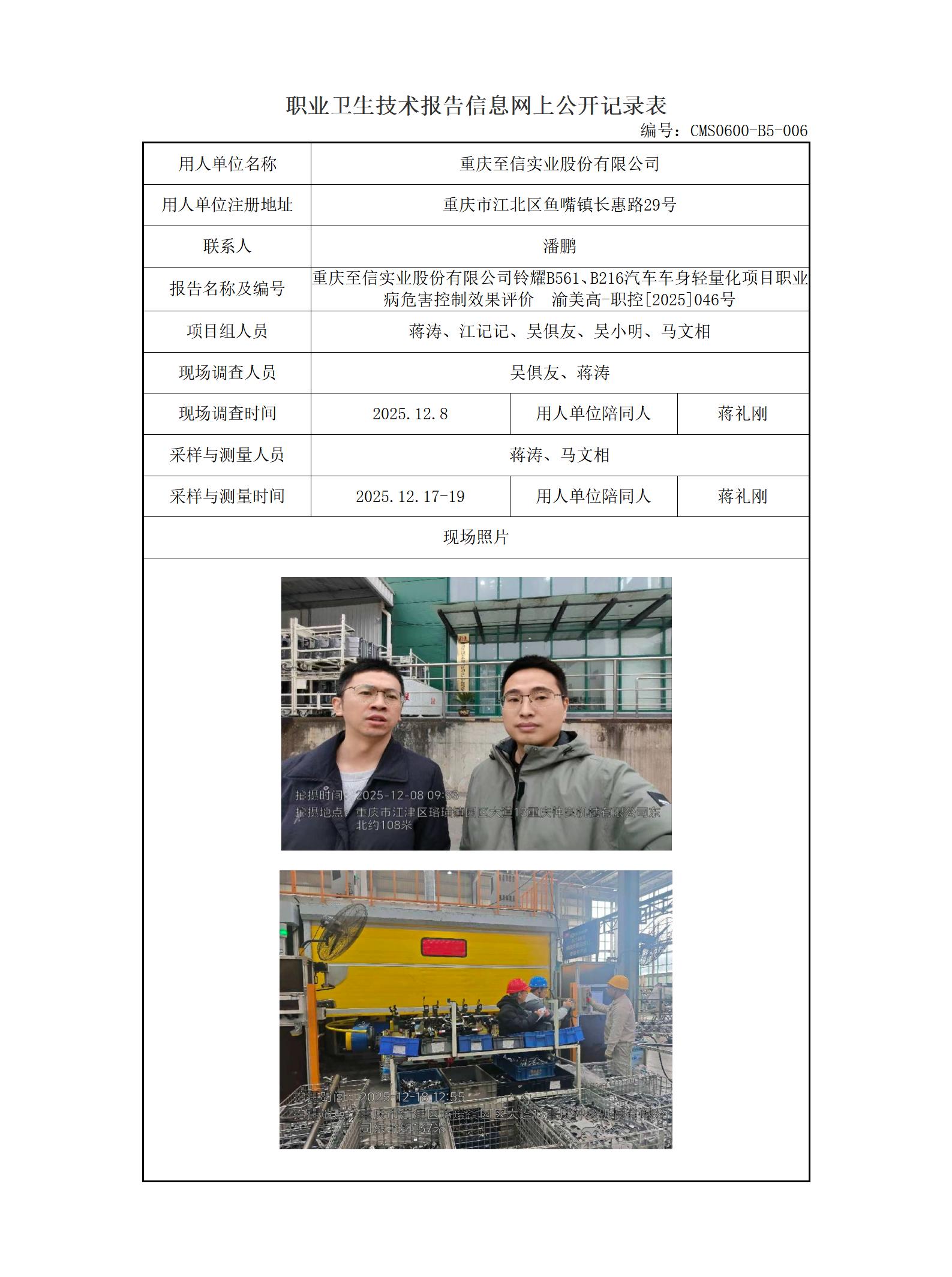 2025年-重庆至信实业股份有限公司铃耀B561、B216汽车车身轻量化项目职业病危害控制效果评价