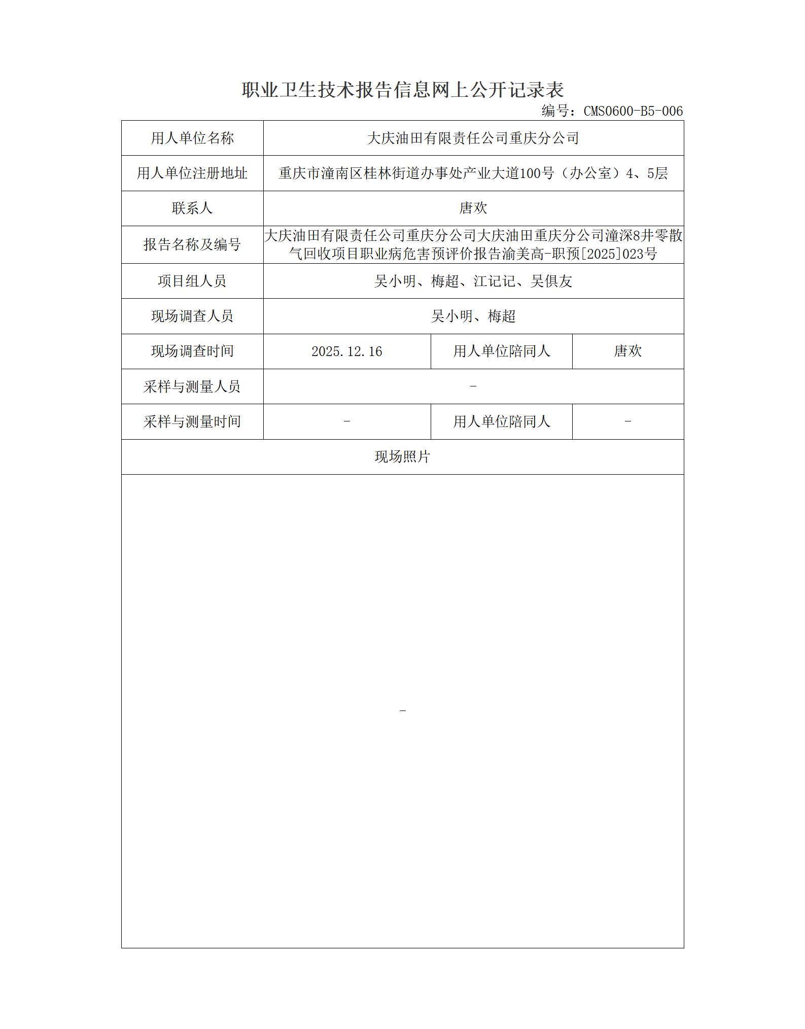 2025年-大庆油田有限责任公司重庆分公司大庆油田重庆分公司潼深8井零散气回收项目职业病危害预评价