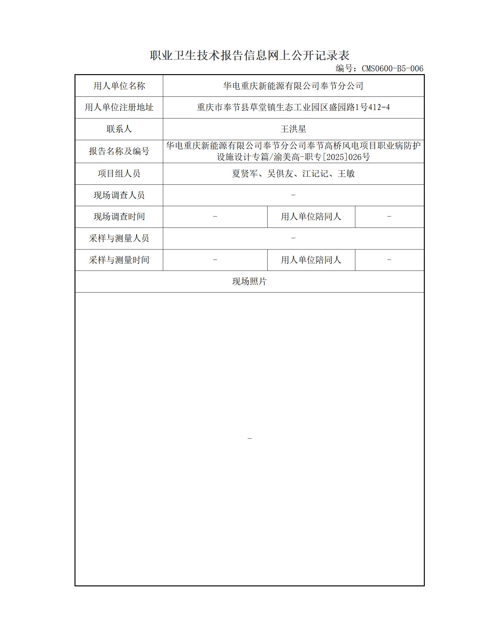 2026年-华电重庆新能源有限公司奉节分公司奉节高桥风电项目职业病防护设施设计专篇