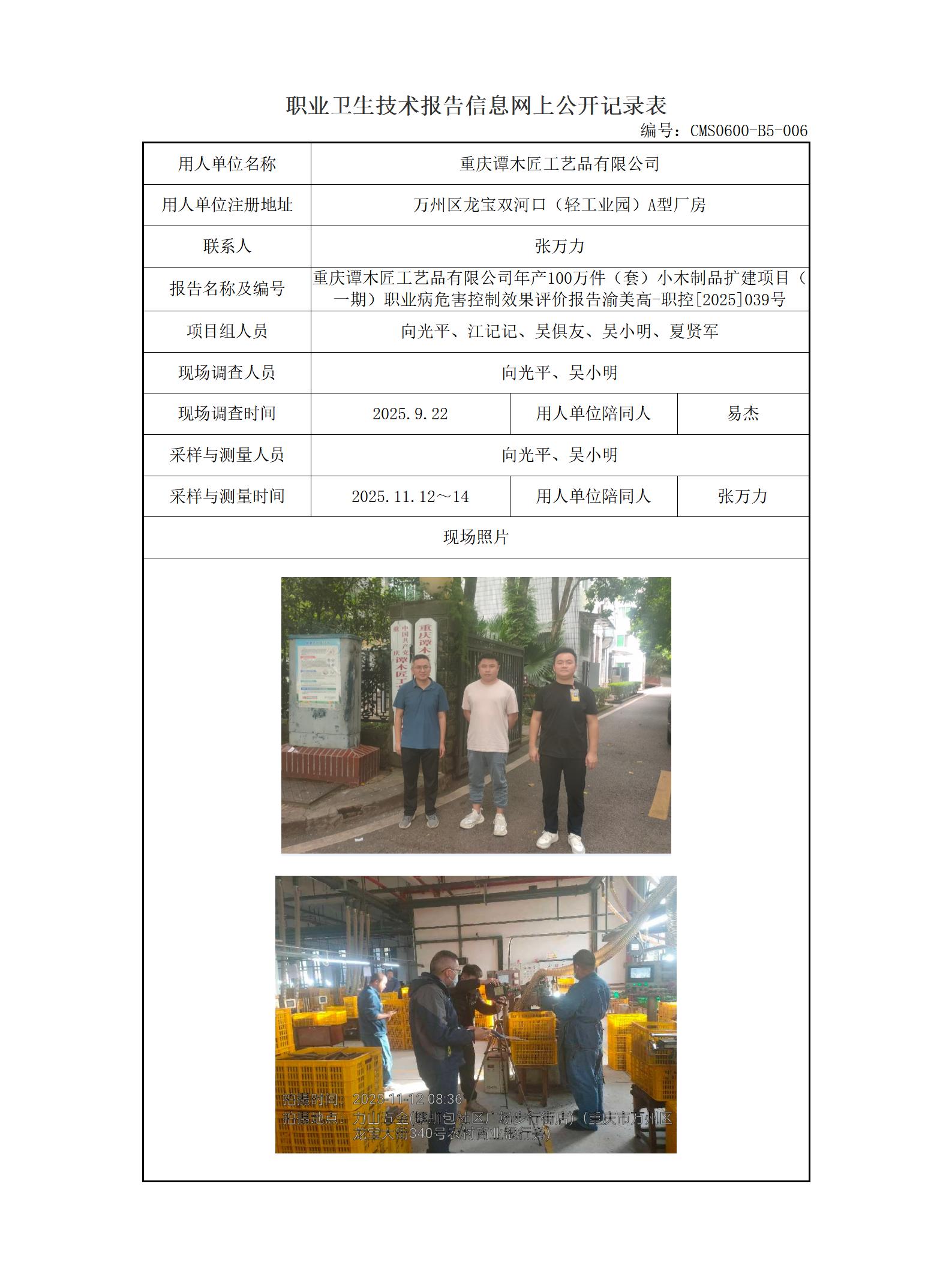 2026年-重庆谭木匠工艺品有限公司年产100万件(套)小木制品扩建项目(一期)职业病危害控制效果评价