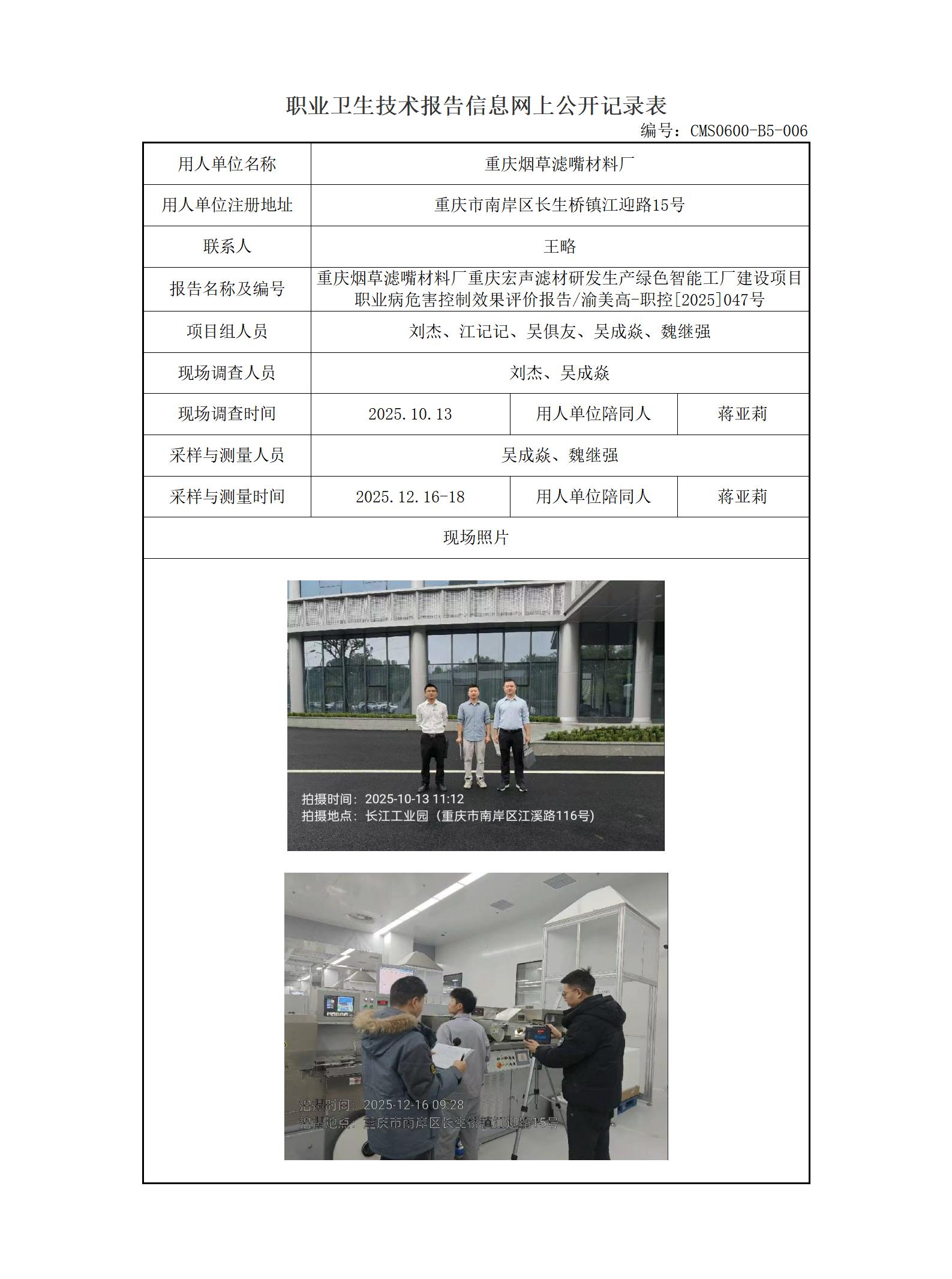 2026年-重庆烟草滤嘴材料厂重庆宏声滤材研发生产绿色智能工厂建设项目职业病危害控制效果评价