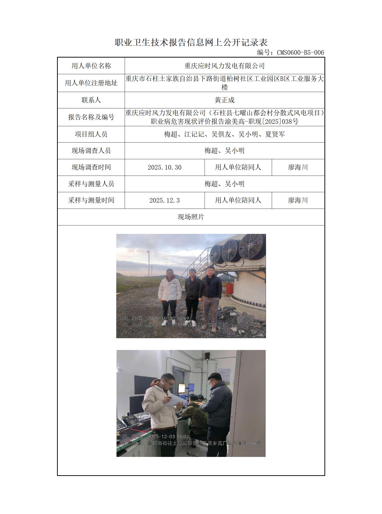 2026年-重庆应时风力发电有限公司(石柱县七曜山都会村分散式风电项目)职业病危害现状评价