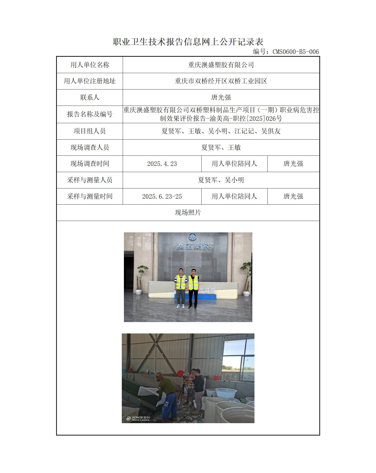 2026年-重庆澳盛塑胶有限公司双桥塑料制品生产项目(一期)职业病危害控制效果评价