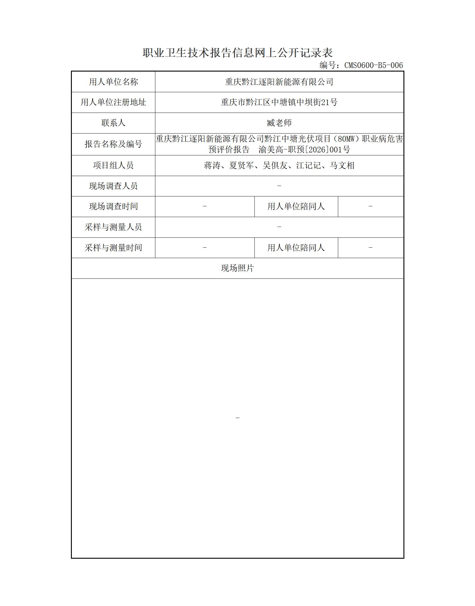 2026年-重庆黔江逐阳新能源有限公司黔江中塘光伏项目(80MW)职业病危害预评价