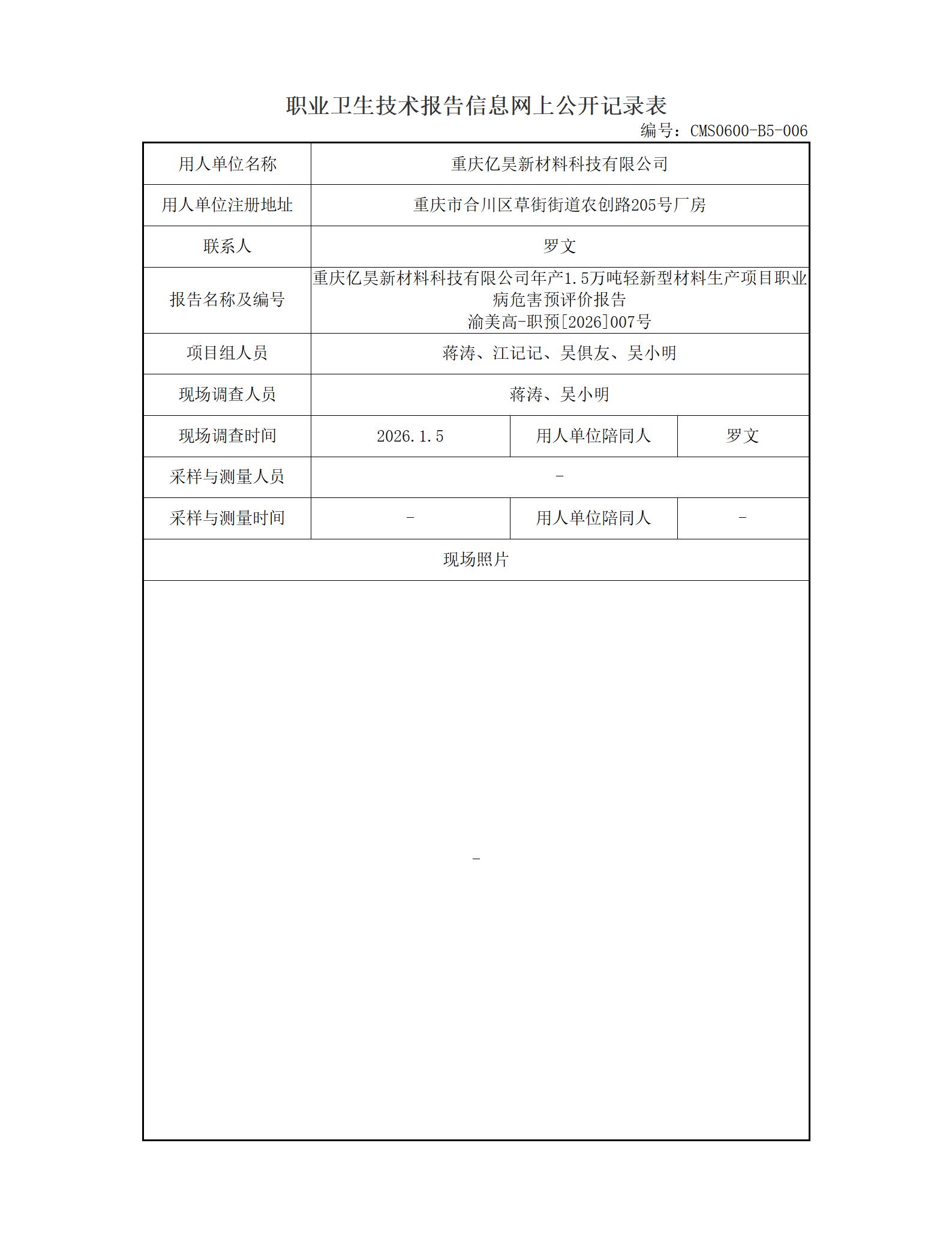 2026年-重庆亿昊新材料科技有限公司年产1.5万吨轻新型材料生产项目职业病危害预评价