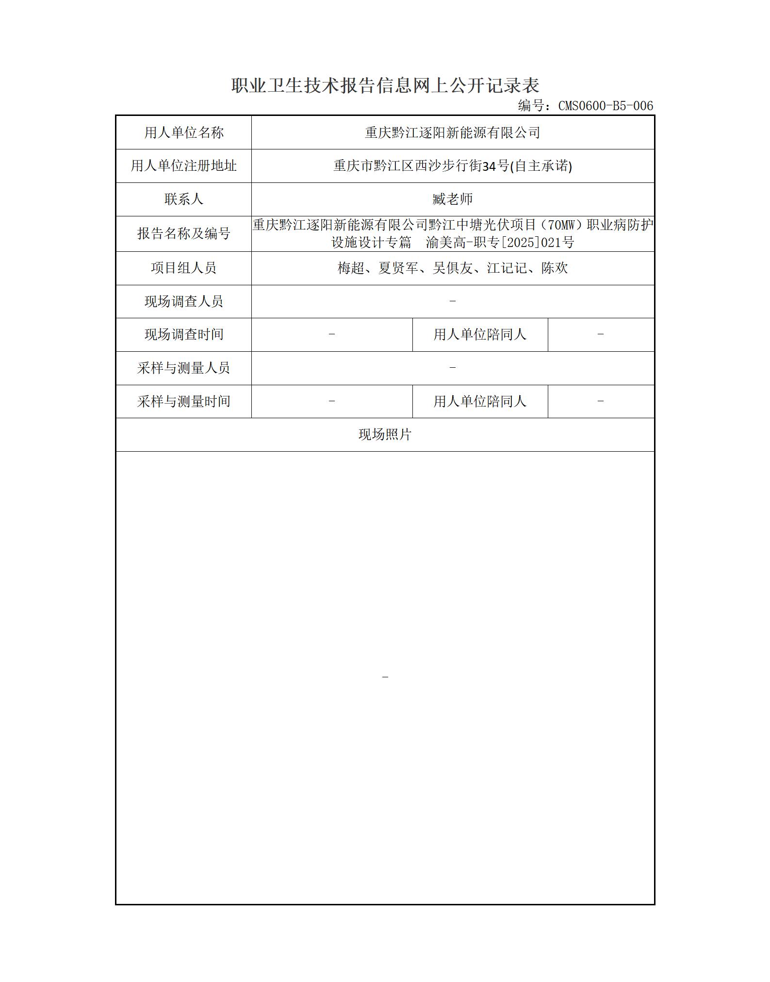 2026年-重庆黔江逐阳新能源有限公司黔江中塘光伏项目(80MW)职业病防护设施设计专篇